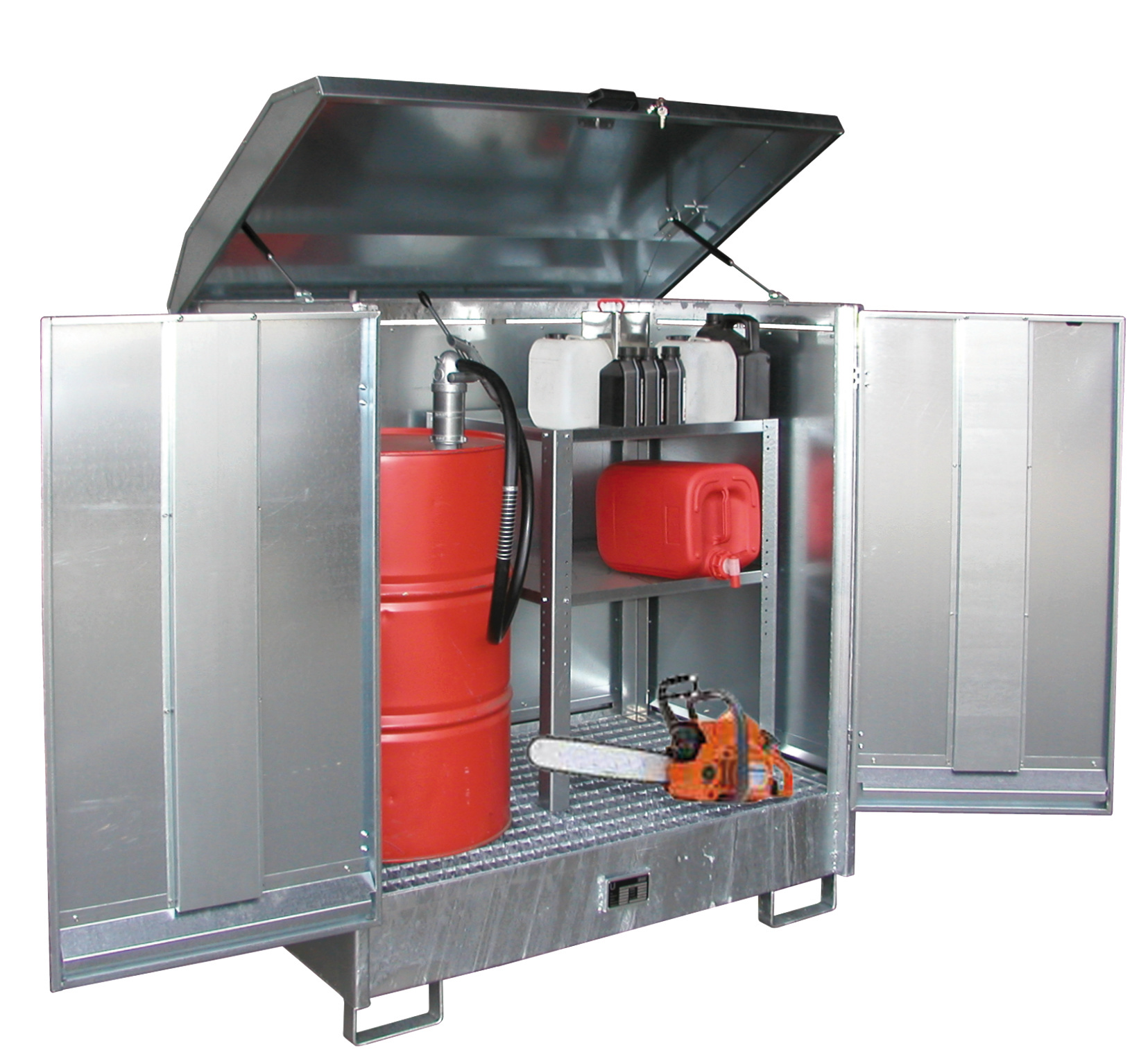 - De vrije hoogte is voldoende om een vat met gemonteerde pomp te kunnen herbergen