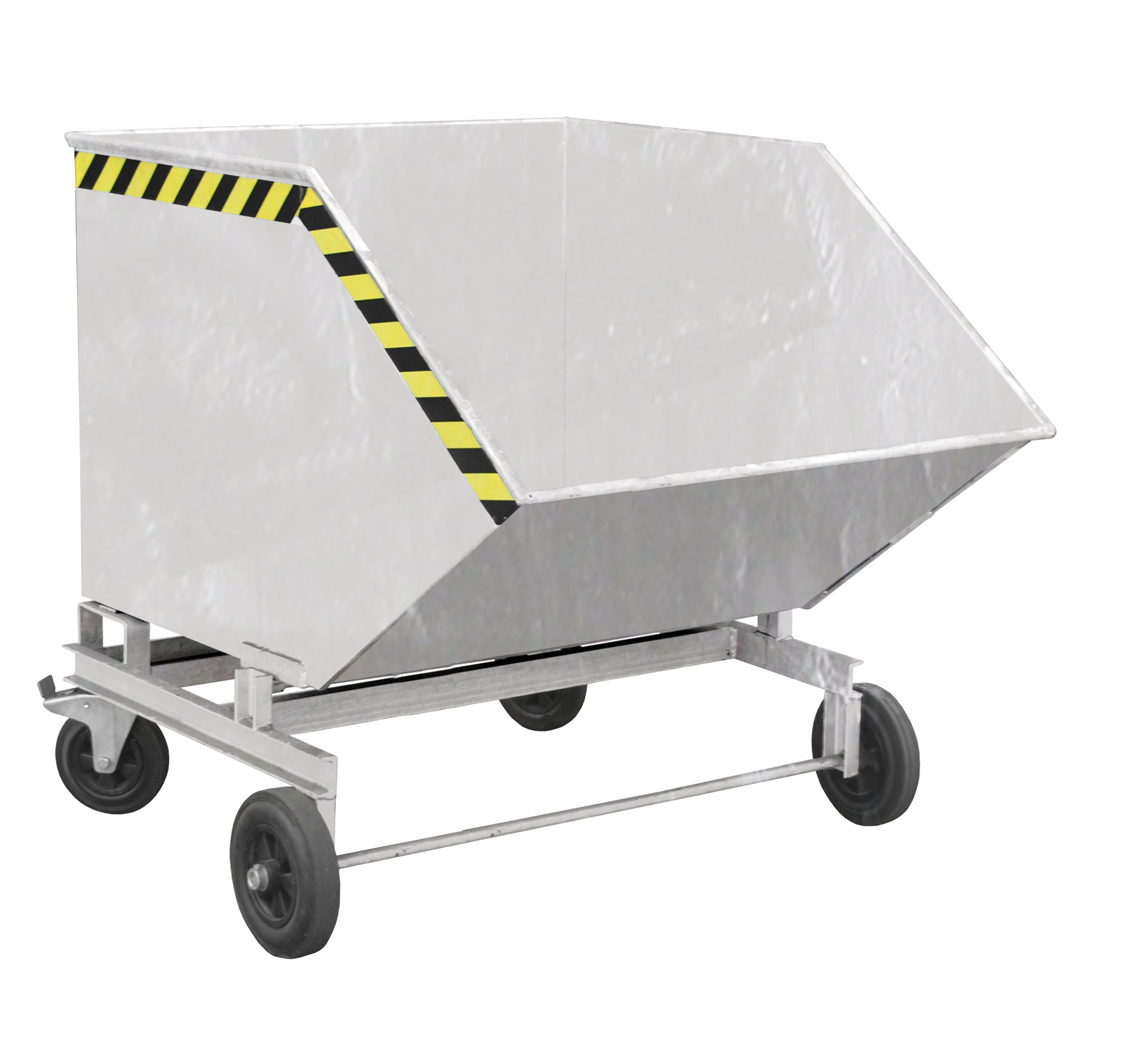 Verrijdbare container met manuele kiepfunctie en gelijkvloerse ledigingsmogelijkheid