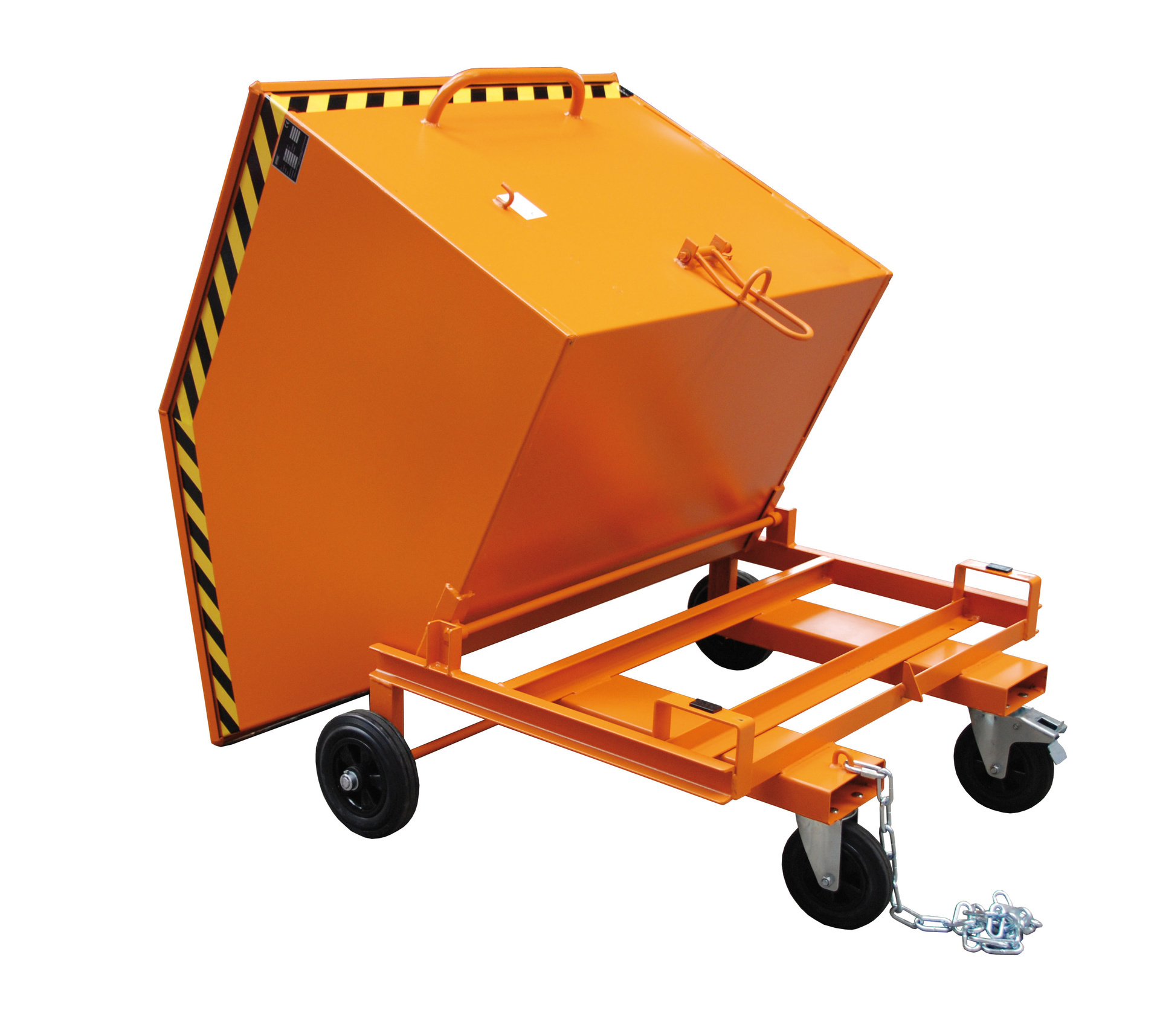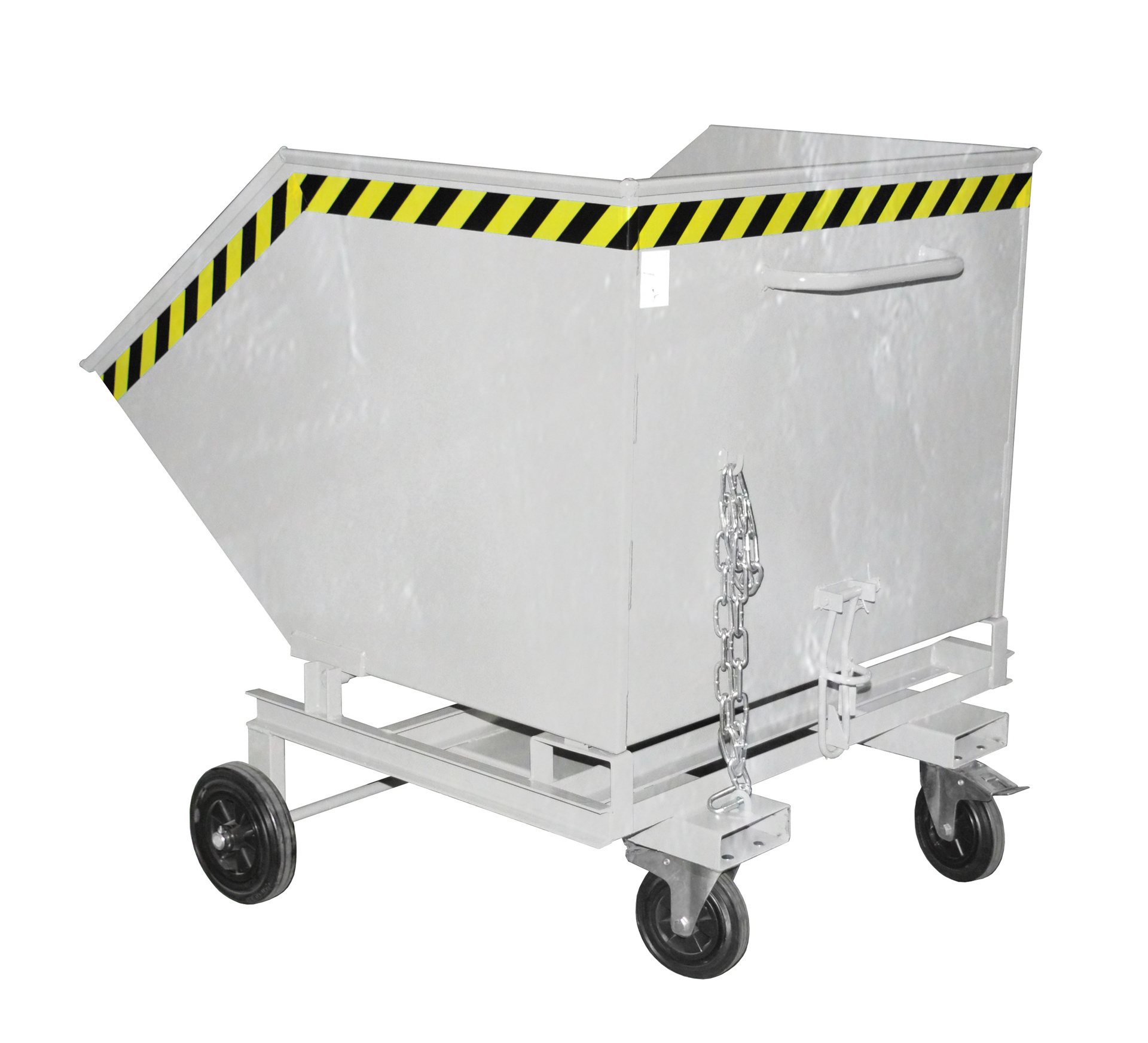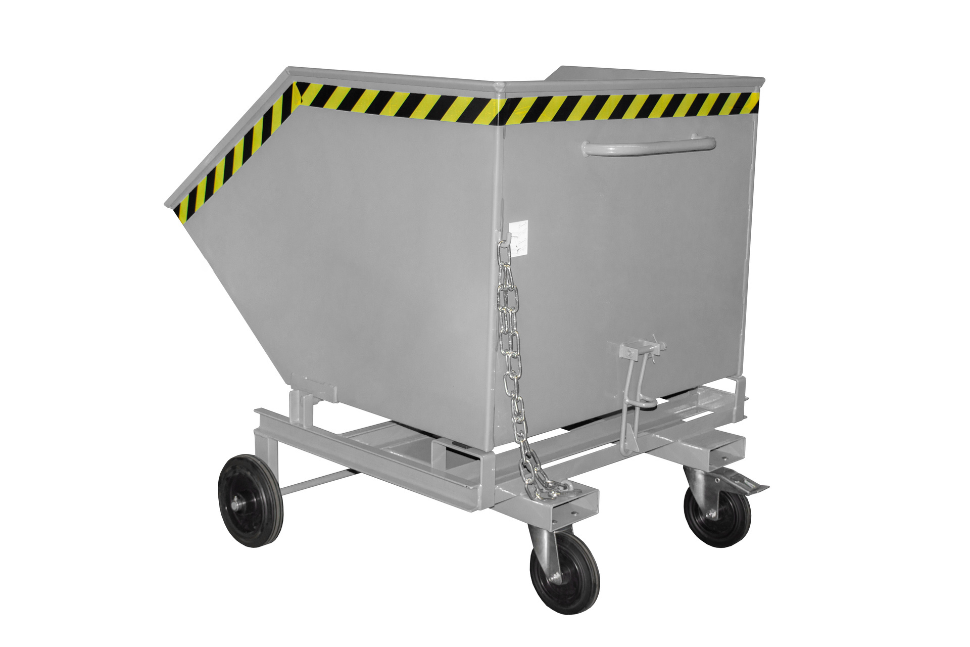 Verrijdbare container met manuele kiepfunctie en gelijkvloerse ledigingsmogelijkheid